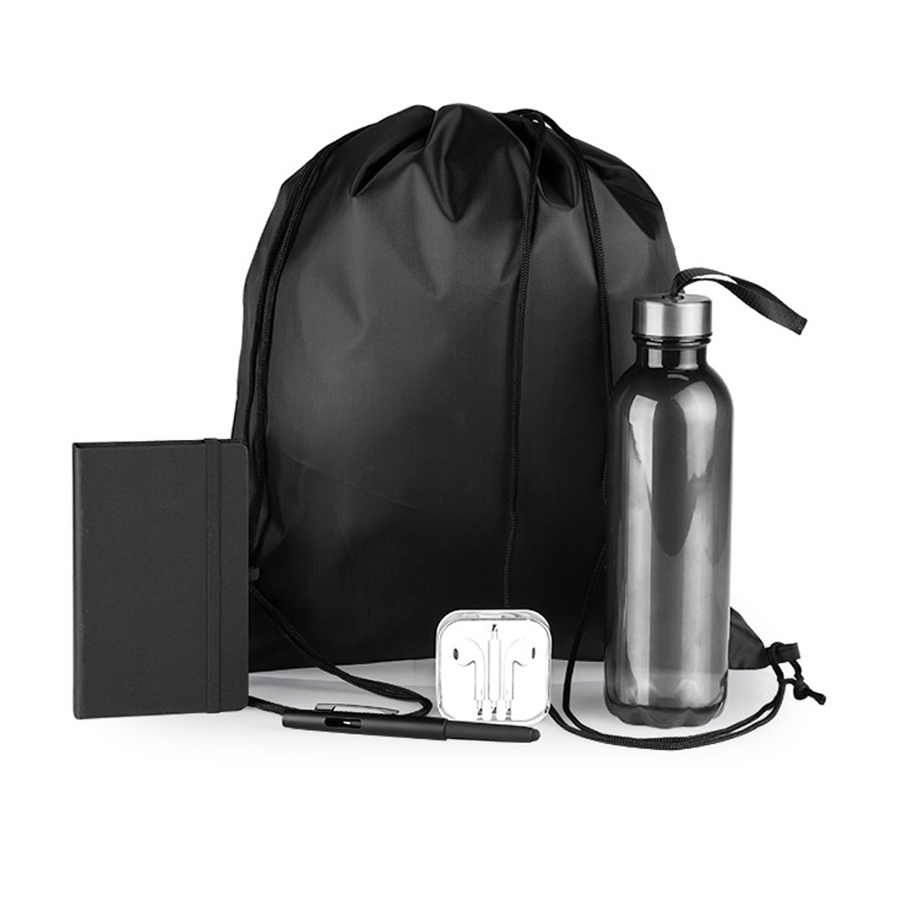 Kit boas vindas. Conta com mochila em nylon 420, garrafa pet, fone de ouvido, caderno sem pauta e caneta esferográfica com tampa e ponta touch.